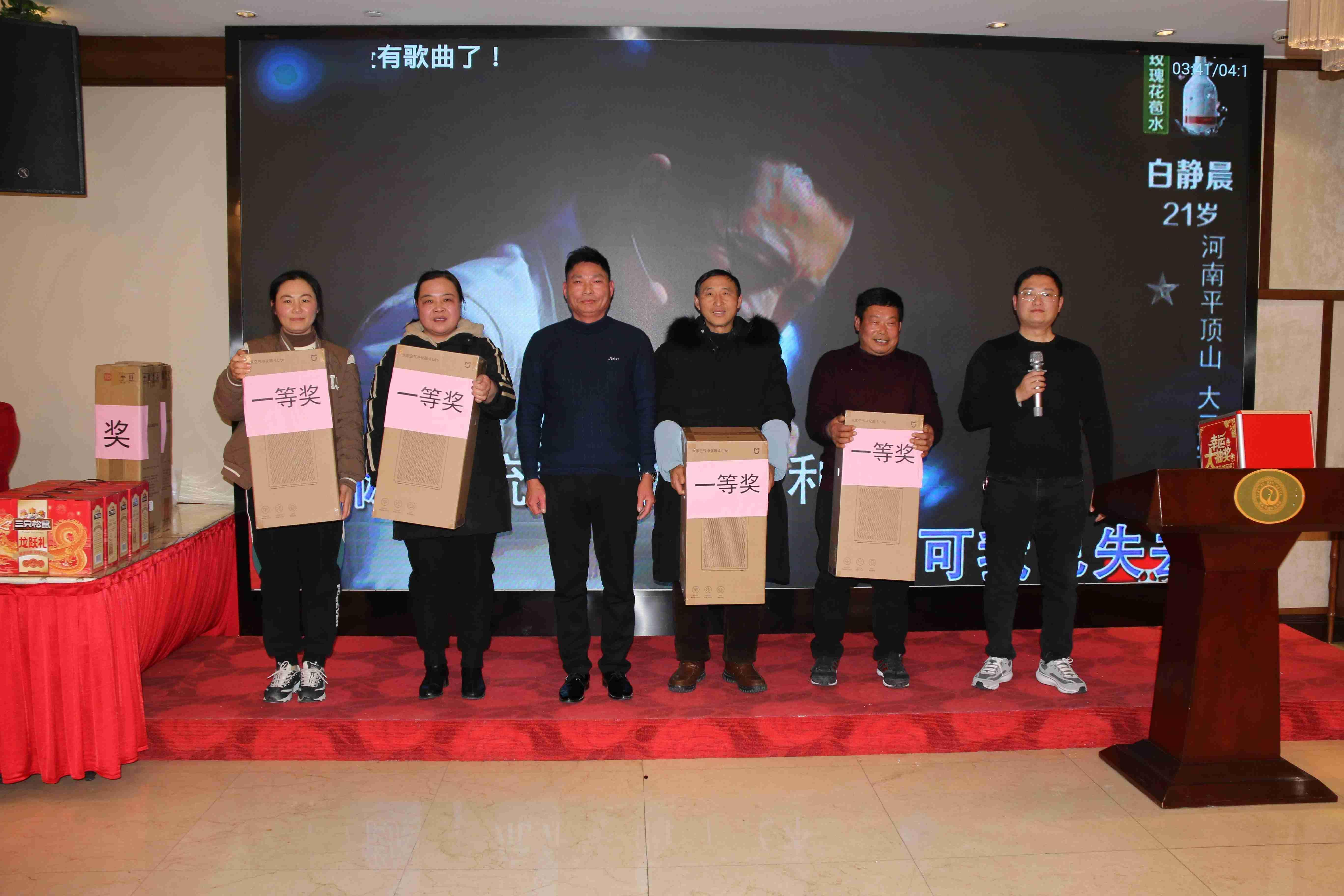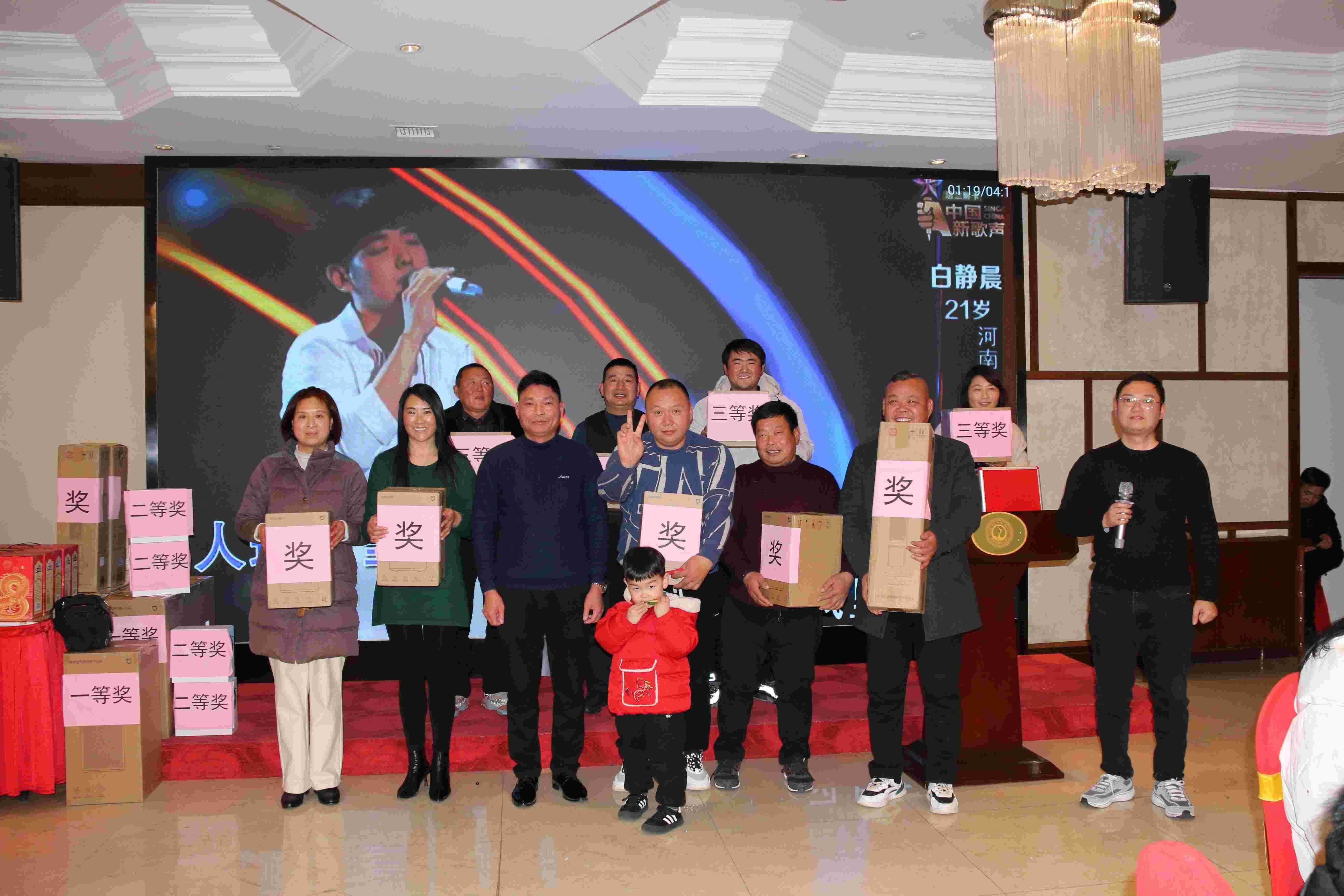 董事长为获得“圣域杯”比赛和晚会抽奖活动三等奖和幸运奖的幸运员工派发奖品