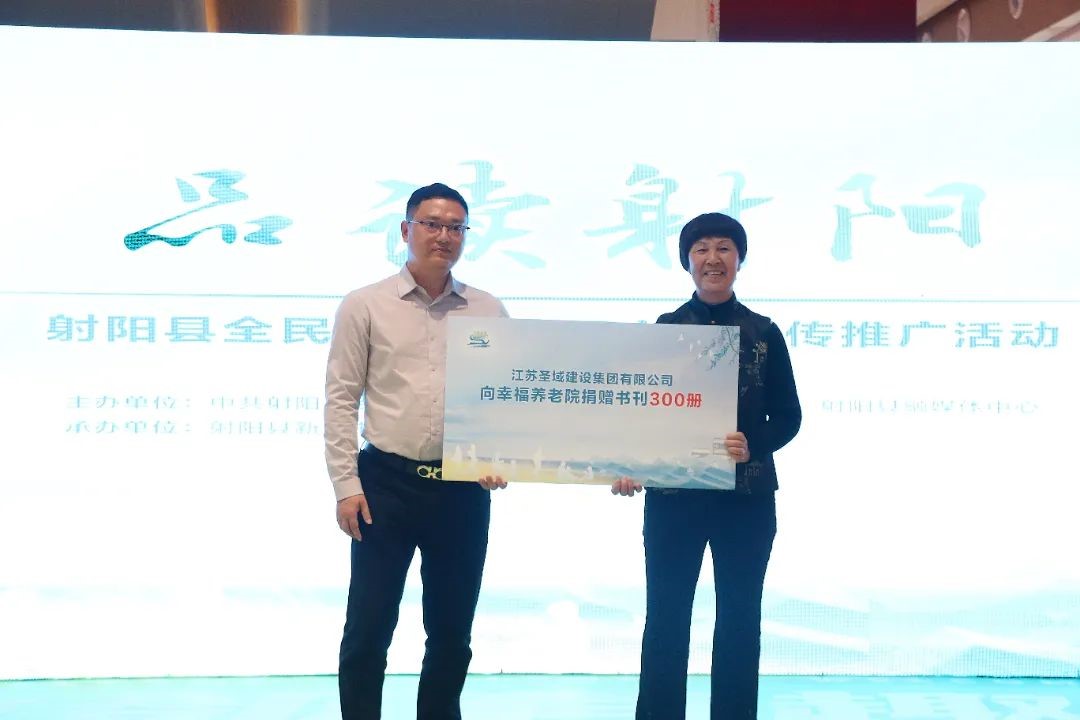 4月19日下午,江苏圣域建设集团有限公司总经理携企业公益之心,出席射阳县凤凰书城"品读射阳"全民阅读活动周启动仪式,并向幸福养老院捐赠优质图刊300册。每一册书籍都承载着圣域集团对老年群体的关怀与敬意,让阅读跨越年龄界限,用文字的温度点亮银发生活的诗意与智慧。